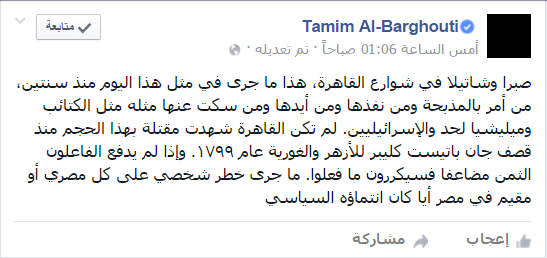 علق الشاعر الفلسطيني، تميم البرغوثي، على أحداث مذبحة رابعة، في ذكراها الثانية، قائلاً "صبرا وشاتيلا في شوارع القاهرة، هذا ما جرى في مثل هذا اليوم منذ سنتين، مَنْ أمر بالمذبحة ومن نفذها وأيدها وسكت عنها مثله مثل ميليشيا لحد...
