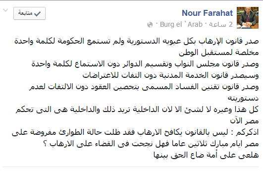 واختتم منشوره قائلًا: “أذكركم: ليس بالقانون يكافح الإرهاب؛ فقد ظلت حالة الطوارئ مفروضة على مصر أيام مبارك ثلاثين عامًا، فهل نجحت في القضاء على الإرهاب؟”.