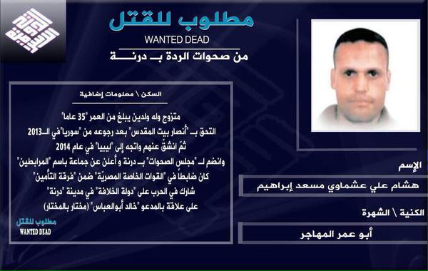 نشر الصحفي عبد المنعم محمود، عبر صفحتة على موقع “تويتر”، أن تنظيم “الدولة” في ليبيا أعلن أن هشام عشماوي، ضابط الصاعقة السابق بالجيش المصري، والمنشق عن أنصار بيت المقدس، مطلوب للقتل.