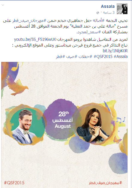 أكدت الفنانة السورية أصالة نصري اليوم الثلاثاء، عبر صفحتها الرسمية بـ”فيس بوك”، أنها سوف تحيي حفلا جماهيريا ضخما ضمن مهرجان صيف قطر على مسرح صالة “علي بن حمد العطية” يوم الجمعة 28 أغسطس، بمشاركة الفنان المغربي الشاب سعد لمجرد.