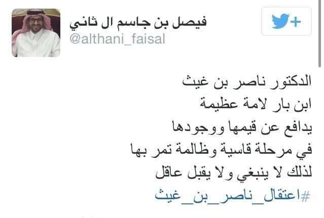 بدوره، غرّد الناشط القطري فيصل بن جاسم آل ثاني: “الدكتور ناصر بن غيث ابن بار لأمة عظيمة، يدافع عن قيمها ووجودها في مرحلة قاسية وظالمة تمر بها، لذلك لا ينبغي ولا يقبل عاقل اعتقاله”.