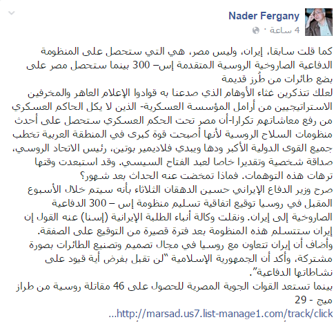 وقال “فرجاني في منشور له عبر موقع التواصل الإجتماعي فيس بوك ” إن لمنظومة الدفاعية الصاروخية التي ستخصل عليها “إيران من روسيا” متقدمه وهي إس– 300 بينما ستحصل مصر على بضع طائرات من طُرز قديمة من طراز ميج – 29″