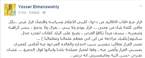 وكتب “المناوهلي” منشورًا عبر صفحته الرسمية على موقع “فيس بوك” قال فيه: “قرار منع طلاب الأقاليم من دخول كليتي الإعلام وسياسة واقتصاد هو قرار غبي بكل ما في كلمة غباء من معنى.. قرار يهدم ولا يبني.. يفرق ولا يجمع.. ينشر كراهية وعنصرية، ينسف مبدأ تكافؤ الفرص، يضيع على البلد كفاءات لمجرد محل سكنهم”.
