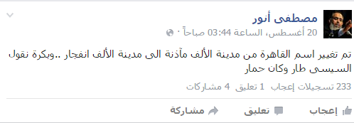 وسخر الصحفي مصطفى أنور قائلاً: “تم تغيير اسم القاهرة من مدينة الألف مئذنة إلى مدينة الألف انفجار.. وبكرة نقول السيسي طار وكان حمار”.