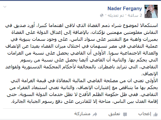 وقال فرجاني -عبر “فيس بوك”، مواصلاً موضوع شراء ذمم القضاء-: “إن المعلومتين تؤكدان إغداق الدولة على القضاة بمبررات واهية مع التقتتير على سواد الناس، على وجود سمات بنيوية في عملية التقاضي في مصر تسهمان في اختلال ميزان القضاء بعيدًا عن الإنصاف والعدالة الاجتماعية سويًّا”.