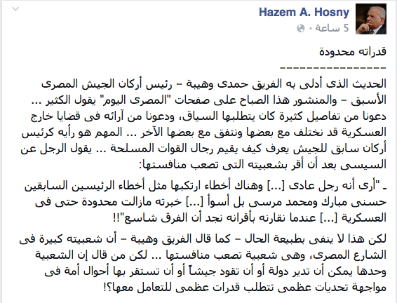 واختتم حسني منشوره قائلاً: “لكن من قال إن الشعبية وحدها يمكن أن تدير دولة أو أن تقود جيشًا أو أن تستقر بها أحوال أمة في مواجهة تحديات عظمى تتطلب قدرات عظمى للتعامل معها”.