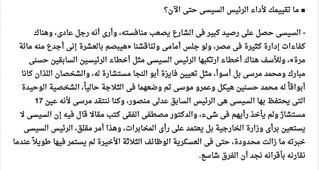 وفي سؤال الجريدة للفريق حمدي هيبة حول رأيه في أداء السيسي أكد أن “السيسي حصل على رصيد كبير في الشارع يصعب منافسته، وأرى أنه رجل عادي، وهناك كفاءات إدارة كثيرة في مصر، ولو جلس أمامي وتناقشنا “هيبصم بالعشرة إنى أجدع منه مائة مرة”.