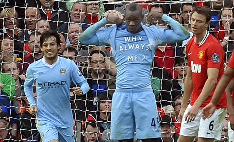 3-في يوم ما عندما كان الإيطالي ماريو بالوتيلي لاعبًا بنادي مانشستر سيتي الإنجليزي وفي مواجهة مانشستر يونايتد أحرز هدفًا رائعًا ليظهر تيشرته الداخلي والذي كتب عليه “لماذا دائمًا أنا” ردًّا على الصحافة العالمية التي تنتقده دائمًا.