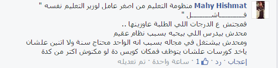 وعلقت Mahy Hishmat قائلة: “منظومة التعليم من أصغر عامل لوزير التعليم نفسه ” فاشل” فمجتش ع الدرجات اللي الطلبة عاوزينها..محدش بيدرس اللي بيحبه بسبب نظام عقيم.. ومحدش بيشتغل في مجاله بسبب إن الواحد محتاج سنة ولا اتنين علشان ياخد كورسات علشان يتوظف فمكان كويس دة لو مكنوش اكتر من كده”.