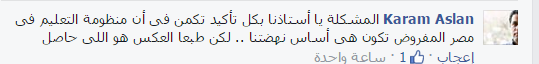 وأضاف Karam Aslan “المشكلة بكل تأكيد تكمن في أن منظومة التعليم في مصر المفروض تكون هي أساس نهضتنا.. لكن طبعًا العكس هو اللي حاصل”.
