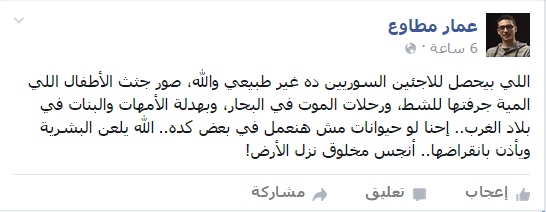 وقال عمار مطاوع: “اللي بيحصل للاجئين السوريين ده غير طبيعي والله، صور جثث الأطفال اللي المية جرفتها للشط، ورحلات الموت في البحار، وبهدلة الأمهات والبنات في بلاد الغرب.. إحنا لو حيوانات مش هنعمل في بعض كده.. الله يلعن البشرية ويأذن بانقراضها.. أنجس مخلوق نزل الأرض!”.