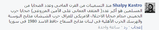 وقال Shalpy Kastro: “منذ تسعينيات القرن الماضي وعدد الضحايا من المسلمين هو أكبر عدد (المثقف العماني على الأمين المزروعي) ضحايا حرب الخميني صدام، ضحايا الاحتلال الأميركي للعراق، حرب الشيشان، مذابح البوسنة والهرسك، الحرب الأهلية في لبنان، مذابح السفاح حافظ الأسد 1980 في سوريا”.
