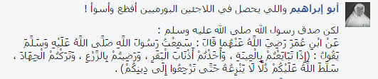 عَنْ ابْنِ عُمَرَ رَضِيَ اللَّهُ عَنْهُما قَالَ: سَمِعْتُ رَسُولَ اللَّهِ صَلَّى اللَّهُ عَلَيْهِ وَسَلَّمَ يَقُولُ: (إِذَا تَبَايَعْتُمْ بِالْعِينَةِ، وَأَخَذْتُمْ أَذْنَابَ الْبَقَرِ، وَرَضِيتُمْ بِالزَّرْعِ، وَتَرَكْتُمْ الْجِهَادَ، سَلَّطَ اللَّهُ عَلَيْكُمْ ذُلًّا لَا يَنْزِعُهُ حَتَّى تَرْجِعُوا إِلَى دِينِكُمْ”.