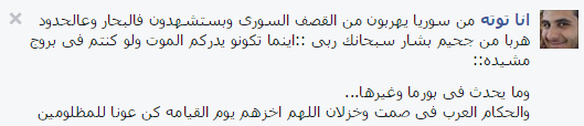 وعلقت “أنا توتة”، قائلة: “من سوريا يهربون من القصف السوري ويستشهدون في البحار وعلى الحدود هربًا من جحيم بشار سبحانك ربي، أينما تكونوا يدرككم الموت ولو كنتم فى بروج مشيدة، وما يحدث في بورما وغيرها.. والحكام العرب في صمت وخزلان.. اللهم اخزهم يوم القيامة كن عونًا للمظلومين”.
