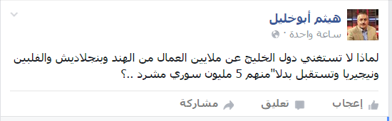 وتساءل الناشط الحقوقي، هيثم أبو خليل، مدير مركز ضحايا لحقوق الإنسان: “لماذا لا تستغني دول الخليج عن ملايين العمال من الهند وبنجلاديش والفلبين ونيجيريا وتستقبل بدلًا “منهم 5 ملايين سوري مشرد..؟”.