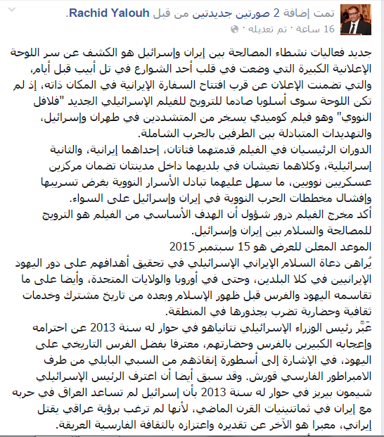 قال رشيد يلوح، الباحث والصحفي المتخصص في الشؤون الإيرانية: إن نشطاء المصالحة بين إيران وإسرائيل، استجدوا أسلوبًا جديدًا، هو الكشف عن سر اللوحة الإعلانية الكبيرة التي وضعت في قلب أحد الشوارع في تل أبيب قبل أيام، والتي تضمنت الإعلان عن قرب افتتاح السفارة الإيرانية في المكان ذاته.