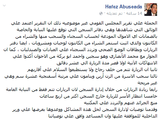 في محاولة منه للدفاع عن الانتقادات الموجهة للمجلس القومي لحقوق الإنسان “حكومي” بخصوص المعتقلين في سجن العقرب – أكد حافظ أبو سعدة – عضو المجلس – أن التقرير اعتمد علي الوثائق التي شاهدها وهي دفاتر السجن التي توقع عليها النيابة، وأيضًا دفتر الزيارات، (أكد عدد من ذوي المعتقلين أنهم في السجون أحيانًا كثيرة يأخذون منهم تصاريح الزيارة لتسجيلها في الدفاتر دون رؤية ذويهم).