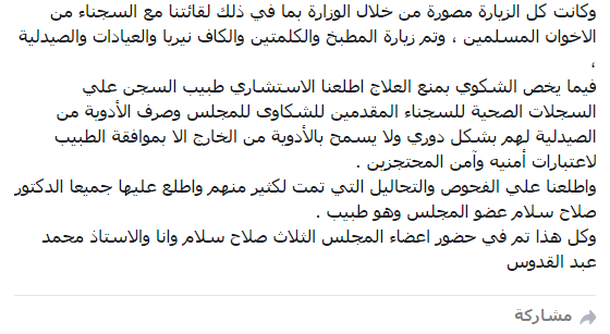 وأضاف، قدمنا توصيات لإدارة السجن لحل هذه المشاكل ووعدوا بعرضها علي وزير الداخلية للموافقة عليها وأن المساعد وافق على توصياتنا، وفيما يخص الشكوى بمنع العلاج أطلعنا الاستشاري طبيب السجن على السجلات الصحية للسجناء المقدمين للشكاوى للمجلس وصرف الأدوية من الصيدلية لهم بشكل دوري ولا يسمح بالأدوية من الخارج إلا بموافقة الطبيب لاعتبارات أمنية وأمن المحتجزين.