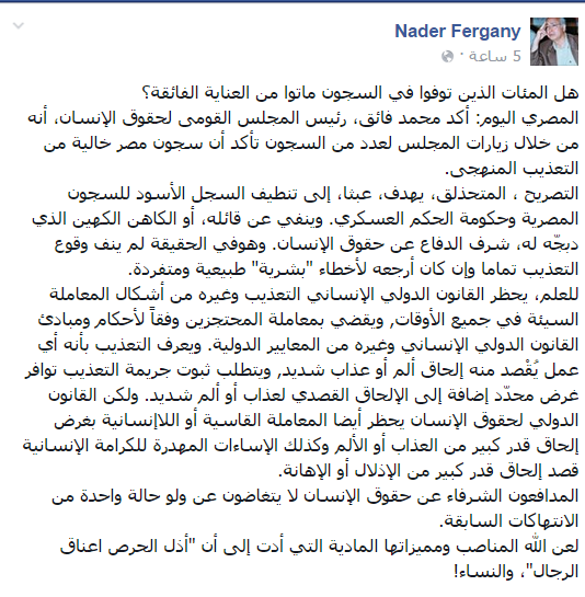 أعرب الدكتور نادر فرجاني، أستاذ العلوم السياسية بجامعة القاهرة، عن دهشته، من تصريح محمد فائق، رئيس المجلس القومي لحقوق الإنسان للمصري اليوم، والذي قال فيه إنه من خلال زيارات المجلس لعدد من السجون تأكد أن سجون مصر خالية من التعذيب المنهجي.