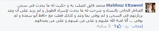 ورد محفوظ الطويل، والد إسراء الطويل- على منشور “فرجاني” قائلا: “محمد فايق اتصلت به وحكيت له ما يحدث في سجن القناطر الخاص بالنساء و شرحت له ما يحدث لإسراء الطويل ولم يزيد على أن وعد بزيارتهم في السجن و لم يوفي بما وعد وكذلك فعلت مع حافظ أبو سعدة ولم يوفي … ألا لعنة الله عليهم وعلى من عينهم وعلى من يصدقهم”.