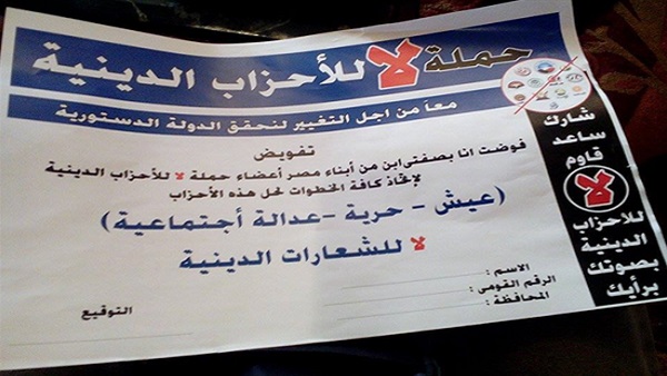 وقال “لاشين”، في بيان له، إن الحملة ستنطلق في الإسكندرية والبحيرة وقنا لتشمل باقي المحافظات بعد ذلك عقب قياس مدي نجاحها وتفاعل المواطنين معها، مشيرًا إلى أن الحملة ستشمل أيضًا توعية المواطنين كذلك بخطورة انتخاب حزب النور الذي يحاول اختطاف الوطن كما حدث مع التجربة المريرة التي عاشها الشعب من جراء انتخاب الإخوان المسلمين لذلك سيكون تركيزنا على عدم إنتاج نظام مبارك من جديدة ودولة الفساد والاستبداد أو كل من يحاول أن يتاجر بالدين.