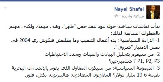 وقال -عبر منشور له على “فيس بوك”-: “بدأت نقاشات ساخنة حول بنود عقد حقل “ظهر”، وهي مهمة، ولكني مهتم بالخطوات السابقة لذلك”، وعددها كالتالي: