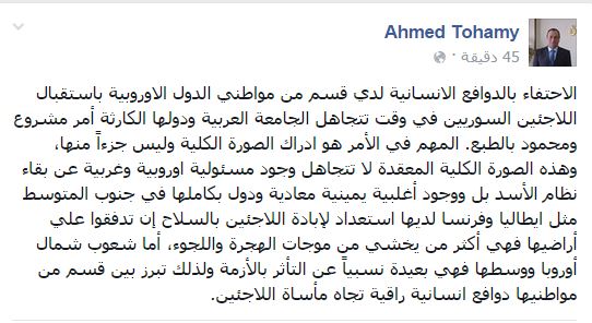 وقال -عبر منشور له على “فيس بوك”-: “الاحتفاء بالدوافع الإنسانية لدى قسم من مواطني الدول الأوروبية باستقبال اللاجئين السوريين في وقت تتجاهل الجامعة العربية ودولها الكارثة أمر مشروع ومحمود بالطبع”.