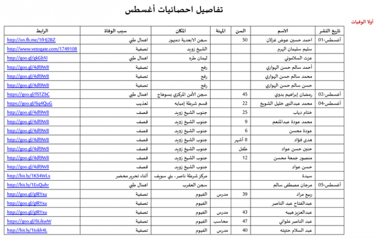وأفاد التقرير بأن حالات الوفاة تنوعت بين 15 “حالة تصفية”، و4 نتيجة التعذيب، و23 حالة إهمال طبي أدت إلى الوفاة، و10 نتيجة “القصف”، وحالة واحدة بطلق ناري في مشاجرة مع أمين شرطة، وحالة انتحار، وأخرى غير معلومة السبب.
