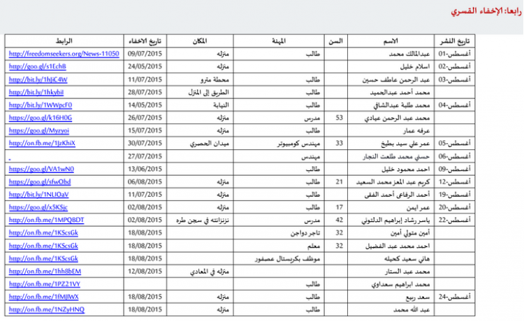 وأفاد المركز بأن التقرير يحتوي على شهادات من هاني الجمل المحتجز بسجن طره، والمصورة إسراء الطويل، والمحتجز أحمد البديوي في سجن وادي النطرون، وشهادات من أسر محتجزين في سجن العقرب ووادي النطرون وبرج العرب، وشهادات أسر محتجزين احتياطيًا في أقسام شرطة المنصورة والشيخ زويد.