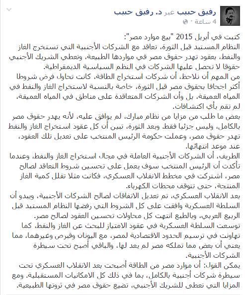 وأعاد نشر تدوينة تم نشرها في أبريل 2015 أشار فيها إلى أنه من المهم ملاحظة أن “شركات استخراج الطاقة، كانت تحاول فرض شروطا أكثر إجحافًا بحقوق مصر قبل الثورة، خاصةً بالنسبة لاستخراج الغاز والنفط في المياه العميقة، بل وأن الشركات المتعاقدة على مناطق في المياه العميقة لم تقم بأي اكتشافات”.