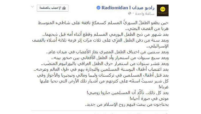 وأضافت الصفحة: “وبعد اغتصاب أطفال البوسنة المسلمين والتجارة بهم في طول العالم وعرضه.. بعد قتل أطفال المسلمين في تركستان وليبيا ومالي ونيجيريا والأحواز وفي كل شبر نسيتُ اسمَه على كثرتهم من أشبار تلك الأرض التي نحيا عليها غرباء! بعد كل ذلك.. تأكَّد أن المسلمين صاروا زومبيا! موتى في صورة أحياء، يحتاجون من يبعث فيهم روح الإسلام من جديد”.