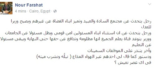 وكتب “فرحات”، في منشور له عبر صفحته الرسمية على موقع “فيس بوك” قائلا: “رجل يتحدث عن مجتمع السادة والعبيد وتميز أبناء القضاة عن غيرهم ويصبح وزيرا للعدل، ورجل يتحدث عن أن استثناء أبناء المسؤولين أمن قومي ويظل مسؤولا عن الجامعات!”.