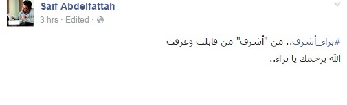 وأضاف: “#براء_أشرف.. من أشرف من قابلت وعرفت، الله يرحمك يا براء”.