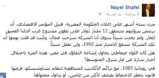 وأضاف: “وكنت قد قلت يومها إن تلك الشركة تسقع الامتياز منذ 1992، ولن تفعل شيئًا”، متسائلاً: “هل كان اللواء عبعاطي يحاول إشاعة التفاؤل في مصر، هذه المرة باختلاق أخبار سارة عن غاز شرق المتوسط؟”.