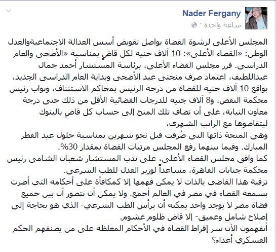أعرب نادر فرجاني عن دهشته من قرار المجلس الأعلى للقضاء الأعلى بـ10 الآف جنيه لكل قاضي بمناسبة عيد الأضحي، معلقا بقوله: " المجلس الأعلى لرشوة القضاة يواصل تقويض أسس العدالة".