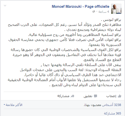 وأضاف المرزوقي:”برافو لسلمية المتظاهرين وما أظهروه من روح مسؤولية عالية، برافو لقوات الأمن التي تصرفت فعلا كأمن جمهوري يحمي ممارسة الحقوق الدستورية ولا يقمعها.”