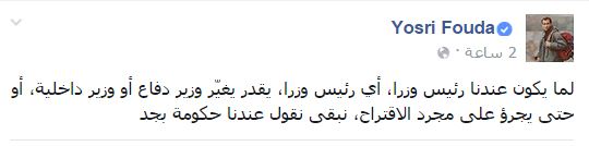 وقال -عبر منشور له على “فيس بوك”-: “لما يكون عندنا رئيس وزرا، أي رئيس وزرا، يقدر يغيّر وزير دفاع أو وزير داخلية، أو حتى يجرؤ على مجرد الاقتراح، نبقى نقول عندنا حكومة بجد”.