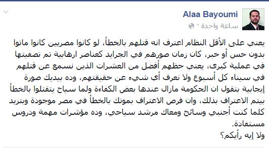 وقال -عبر منشور له على “فيس بوك”-: “يعني على الأقل النظام اعترف أنه قتلهم بالخطأ، لو كانوا مصريين كانوا ماتوا بدون حس أو خبر، كان زمان صورهم في الجرايد كعناصر إرهابية تم تصفيتها في عملية كبرى”.