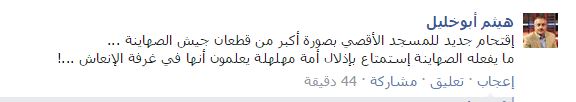 وقال -عبر منشور له على “فيس بوك”-: “اقتحام جديد للمسجد الأقصي بصورة أكبر من قطعان جيش الصهاينة.. ما يفعله الصهاينة استمتاع بإذلال أمة مهلهلة يعلمون أنها في غرفة الإنعاش”.