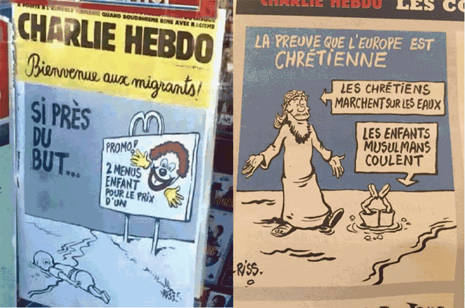 وكانت صحيفة “شارلي إيبدو” الفرنسية قد نشرت رسومًا كاريكاتورية، تسخر من موضوع غرق اللاجئين السوريين، إذ نشرت رسمًا مشابهًا لـ”إيلان الكردي”، الطفل الذي وجدت جثته على شاطئ بوردوم بتركيا، وتسببت صورته في موجة تعاطف غير مسبوق مع معاناة اللاجئين السوريين.
