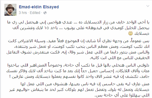 وقال المدون والمصور عماد الدين السيد: “يا أخي الواحد خايف من زرار الديسلايك ده، عندي هواجس إني هيحصل لي زي ما بيحصل للخليل كوميدي في فيديوهاته على “يوتيوب”، ياخد ١٥ لايك وعشرين ألف ديسلايك”.