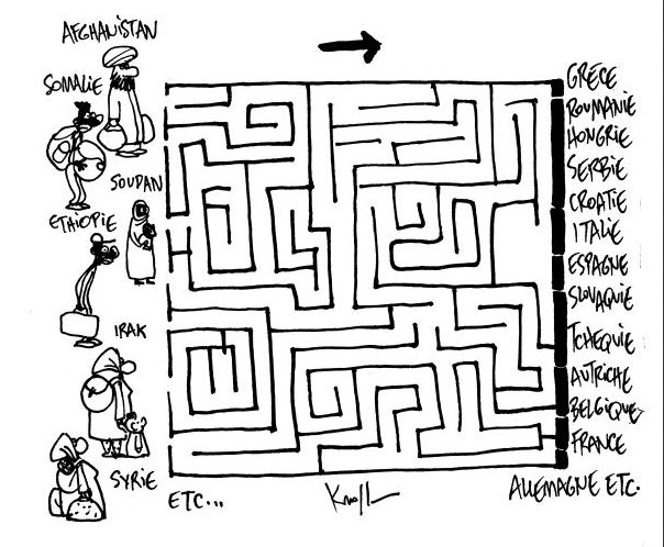 ولا تزال صحيفة “لو سوار” البلجيكية مهتمة بقضية اللاجئين بعدما تناولت رسما كاريكاتيريا، يصور قارة أوروبا كمغارة للمتاهات، التي يتوه فيها الهاربون من الأوضاع المأساوية ببلادهم، بعد أن تباينت موقف الدول الأوروبية منها بين مرحبة وأخرى أغلقت حدودها.