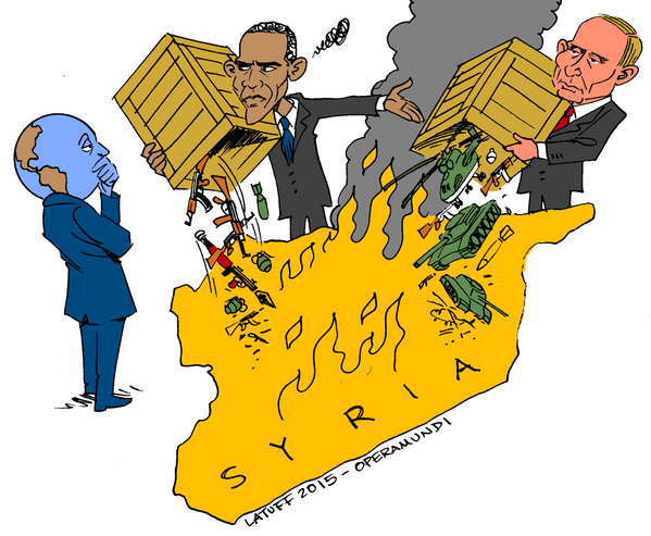 واهتمت صحيفة “أوبرا مونداي” البرازيلية، بعرض كاريكاتير للرسام العالمي كارلوس لاتوف ظهر خلاله كل من الرئيس الأميركي باراك أوباما والرئيس الروسي فلاديمير بوتين وهما يضعان كل ما بجعبتهما من أسلحة ومعدات حربية داخل سوريا، بينما يظهر العالم متجسدا في هيئة رجل ليكتفي بالمشاهدة.
