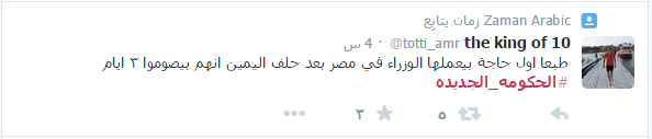وغرد صاحب حساب آخر قائلاً: “طبعًا أول حاجة بيعملها الوزراء في مصر بعد حلف اليمين أنهم بيصوموا ٣ أيام”.