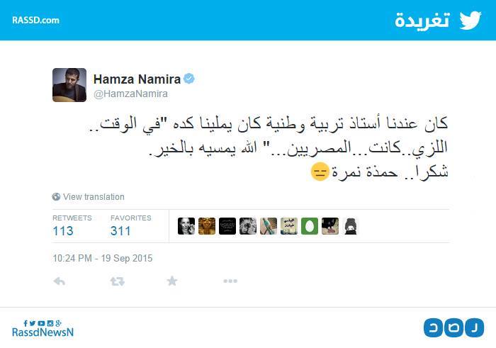 يقول الفنان حمزة نمرة: “كان عندنا أستاذ تربية وطنية كان يملينا كده: “في الوقت.. اللزي..كانت..المصريين..الله يمسيه بالخير” شكرًا حمذة نمرة.