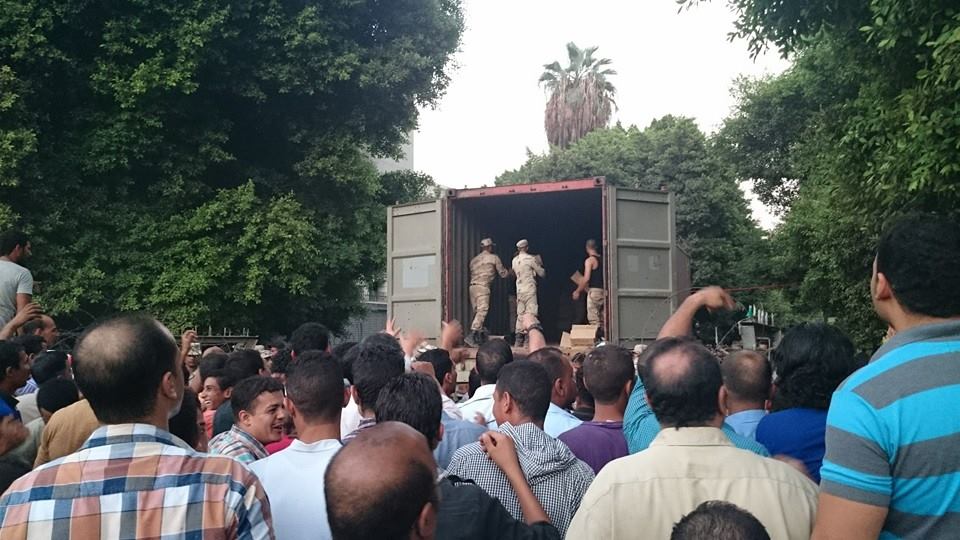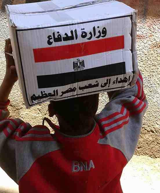 ومنذ الاستفتاء علي الدستور والانتخابات الرئاسية، بدأ الجيش في توزيع كراتين مواد غذاية علي المواطنين لحثهم علي المشاركة في الانتخابات.