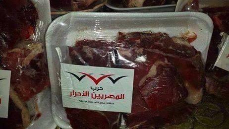 ووزع حزب المصريين الأحرار بتوزيع أكياس من اللحوم تحمل شعار الحزب في المناطق الفقيرة.