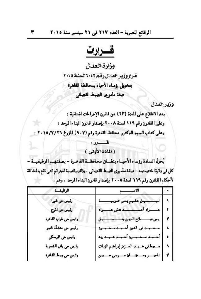 وجاء نص القرار كما نُشر بالجريدة الرسمية: “يخول السادة رؤساء الأحياء بنطاق محافظة القاهرة بصفتهم الوظيفية كل في دائرة اختصاصه صفة مأموري الضبط القضائي وذلك بالنسبة للجرائم التى تقع بالمخالفة لأحكام القانون”.