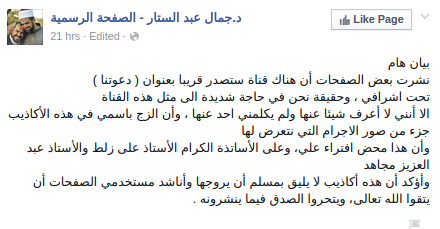 وقال “عبدالستار” -في تدوينة بموقع التواصل الاجتماعي “فيس بوك”-: “نشرت بعض الصفحات أن هناك قناة ستصدر قريبًا بعنوان (دعوتنا) تحت إشرافي، وحقيقة نحن في حاجة شديدة إلى مثل هذه القناة”.