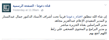 وقد كتبت قناة “دعوتنا” -عبر صفحتها الرسمية، في تدوينة بـ”فيس بوك”-: “إن شاء الله تنطلق #قناة_دعوتنا قريبًا تحت إشراف الأستاذ الدكتور جمال عبدالستار، والمدير التنفيذي الإعلامي عبدالعزيز مجاهد، مدير المراسلين بقناة الجزيرة مباشر، ومدير البرامج والمحتوى الصحفي علي زلط، اللهم انفع بهم”.